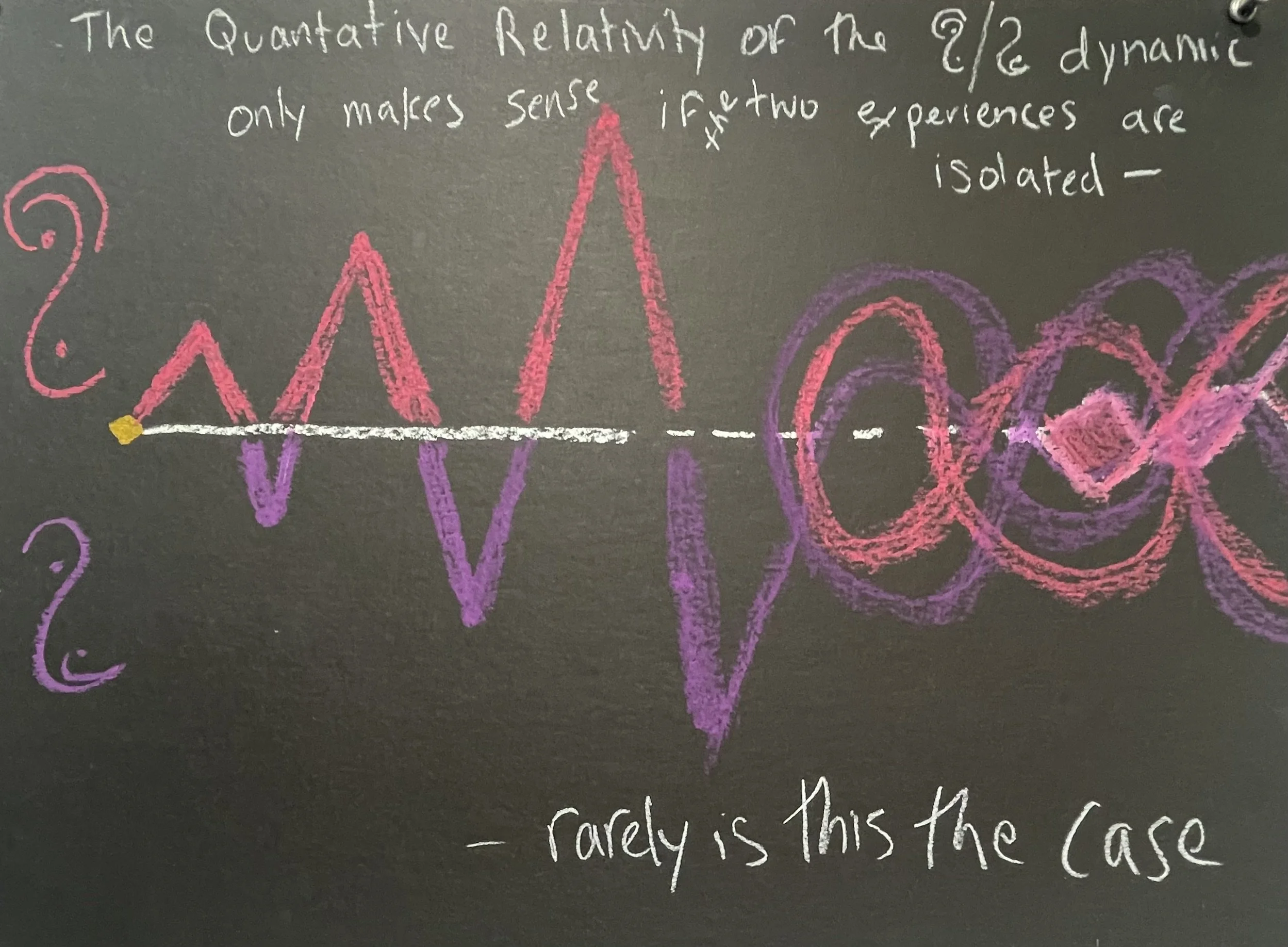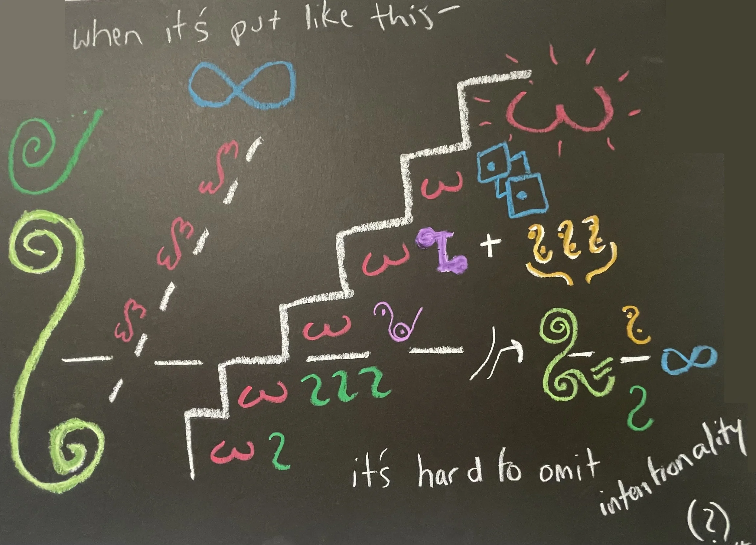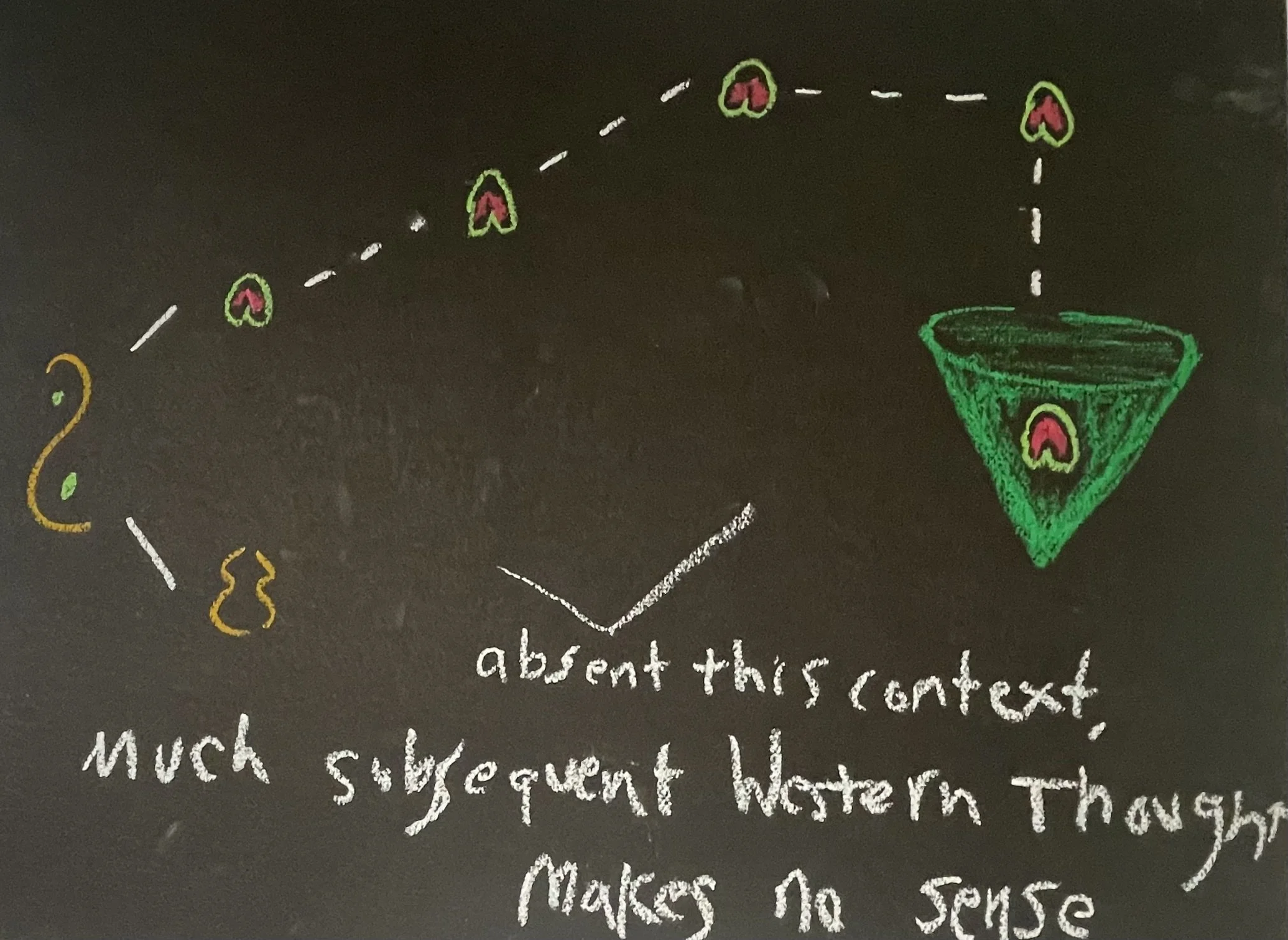 I used lines, arrows, connectors, symbolic logic signs, etc. to indicate relationships between the concepts and form the argument. The black matte background stood in for the blackboard and chalk pastels for well, chalk.