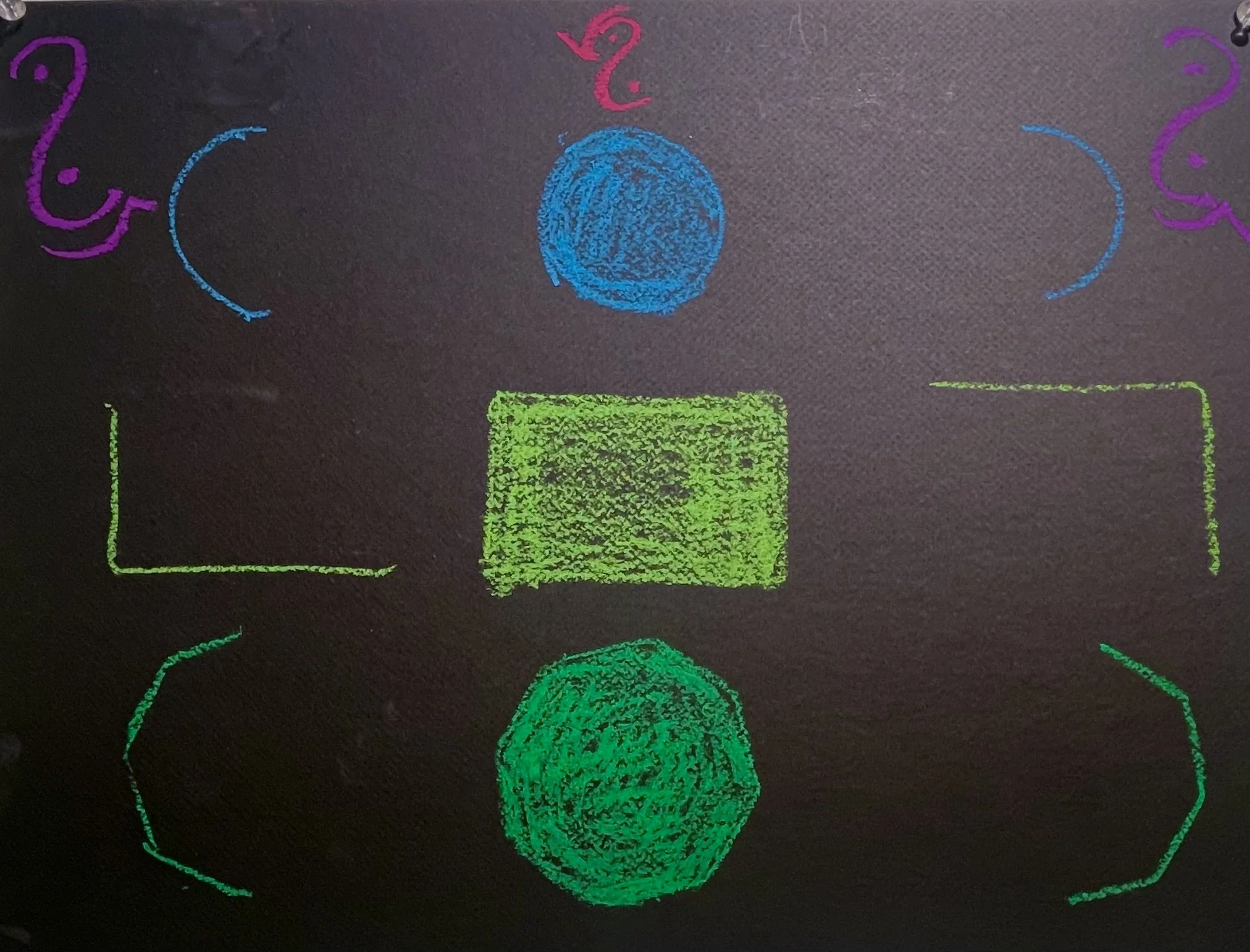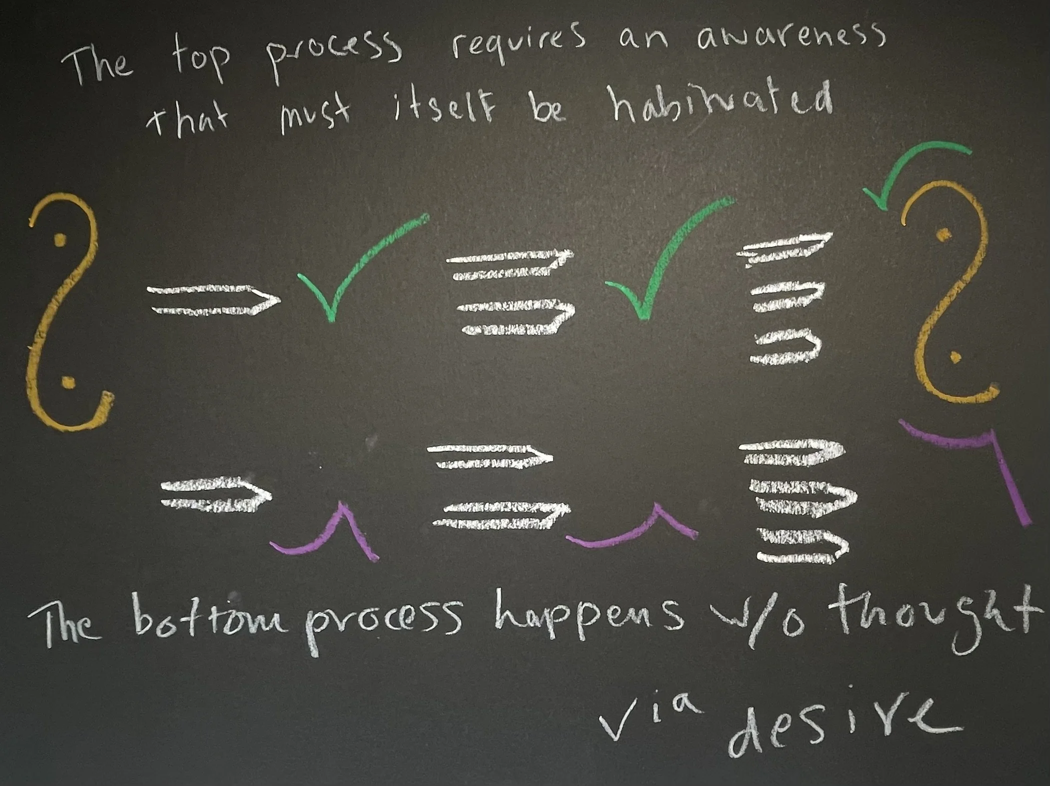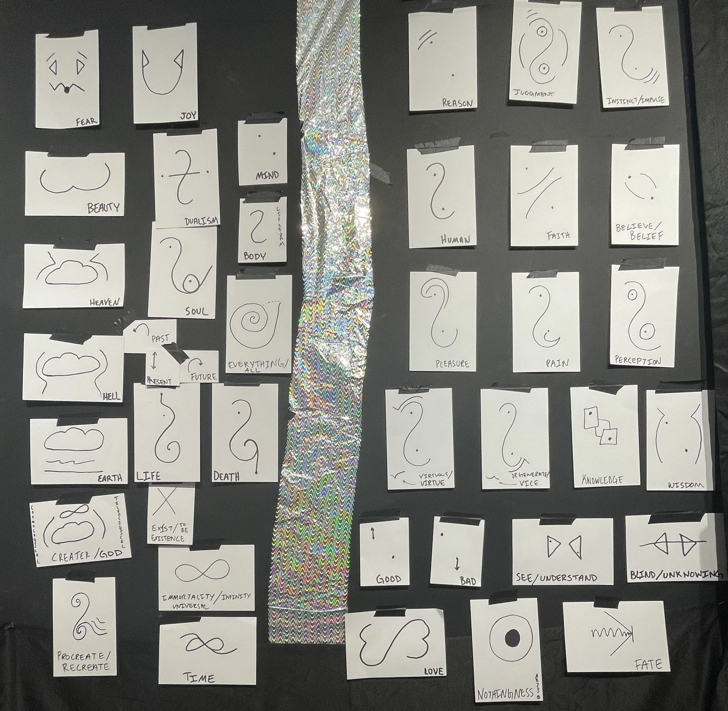 I used lines, arrows, connectors, symbolic logic signs, etc. to indicate relationships between the concepts and form the argument. The black matte background stood in for the blackboard and chalk pastels for well, chalk.